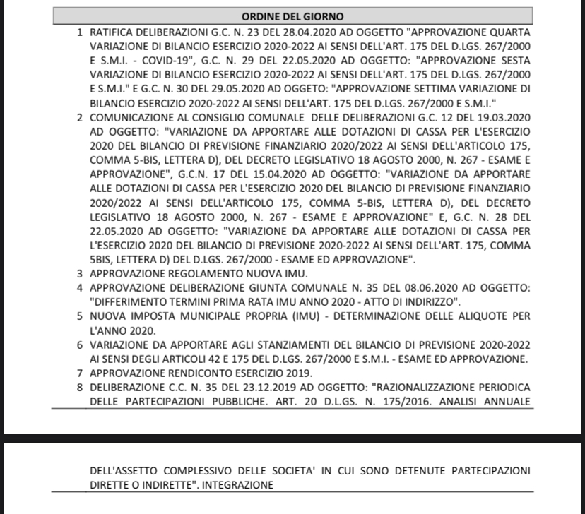 Si ricorda che domani lunedì 29 giugno 2020 alle ore 19 è convocato il Consiglio Comunale presso la sala consiliare per trattare i seguenti punti all’ordine del giorno.