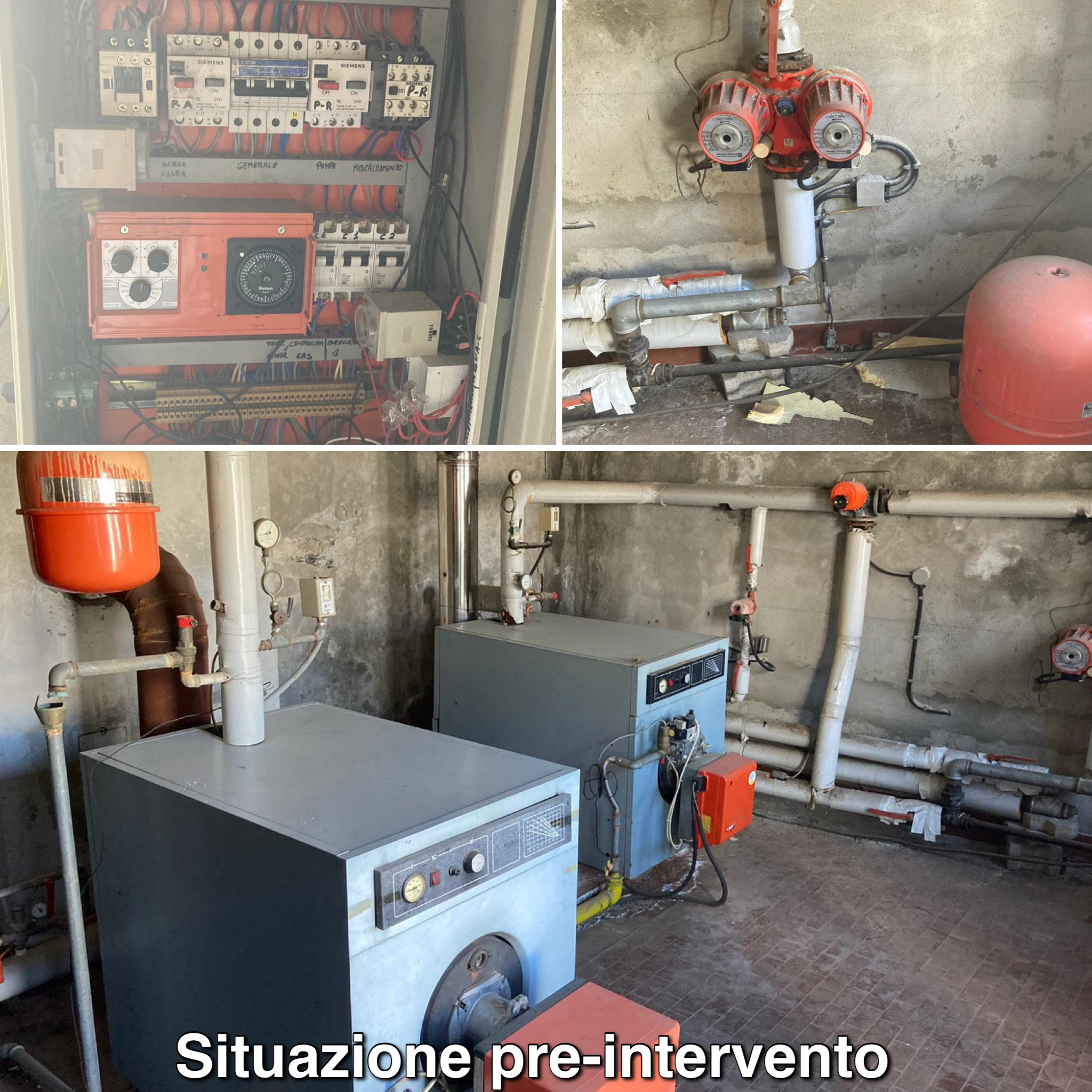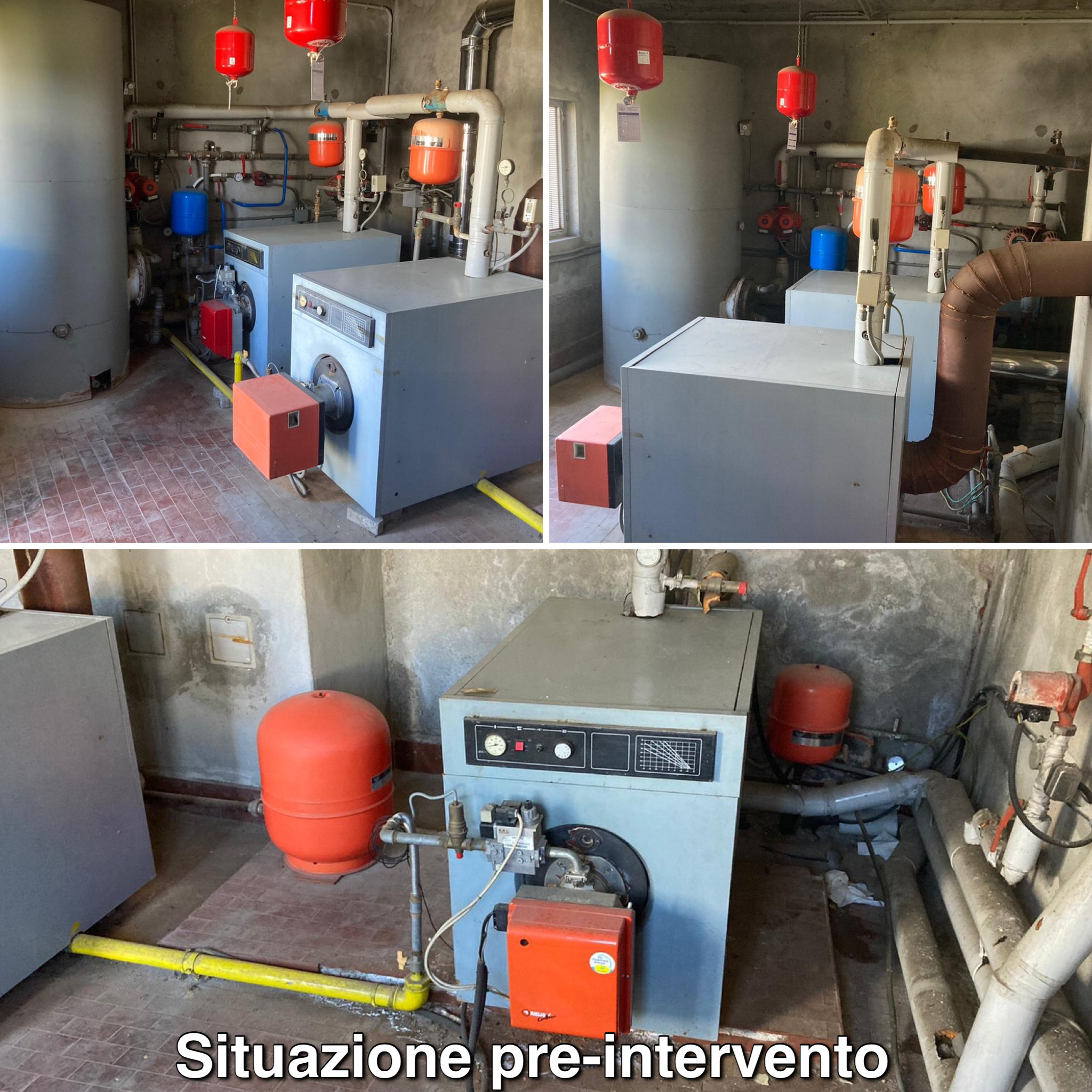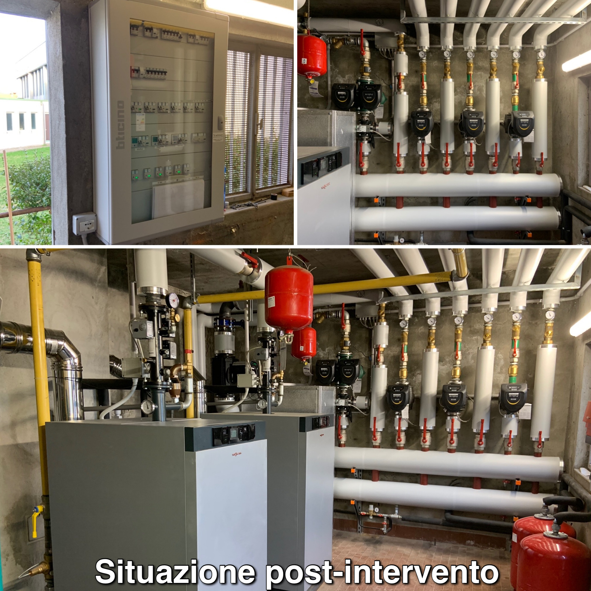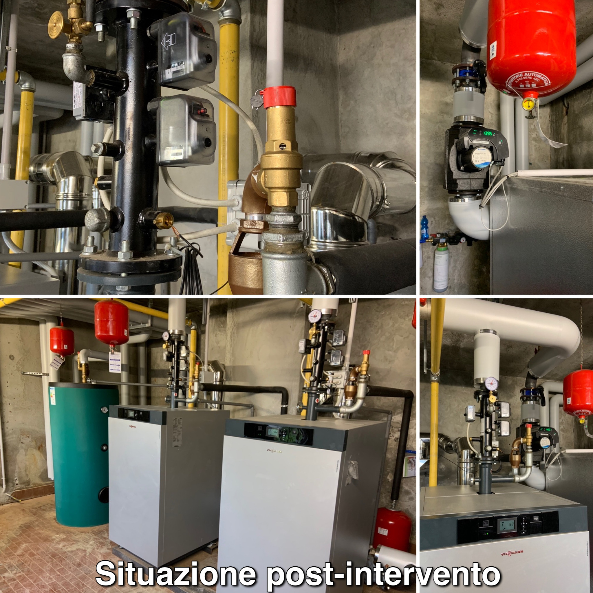 Con i lavori di efficientamento energetico sono state installate due nuove caldaie a condensazione VIESSMANN di ultima generazione, dotate di una potenza globale ottimizzata in grado di soddisfare il carico termico dei tre edifici oltre alla produzione di acqua calda sanitaria. Queste caldaie sono dotate di un sistema di permutazione e modulazione in grado di farle funzionare a cascata in base alle reali richieste di fabbisogno termico degli edifici, ottimizzando quindi il consumo energetico in maniera considerevole.