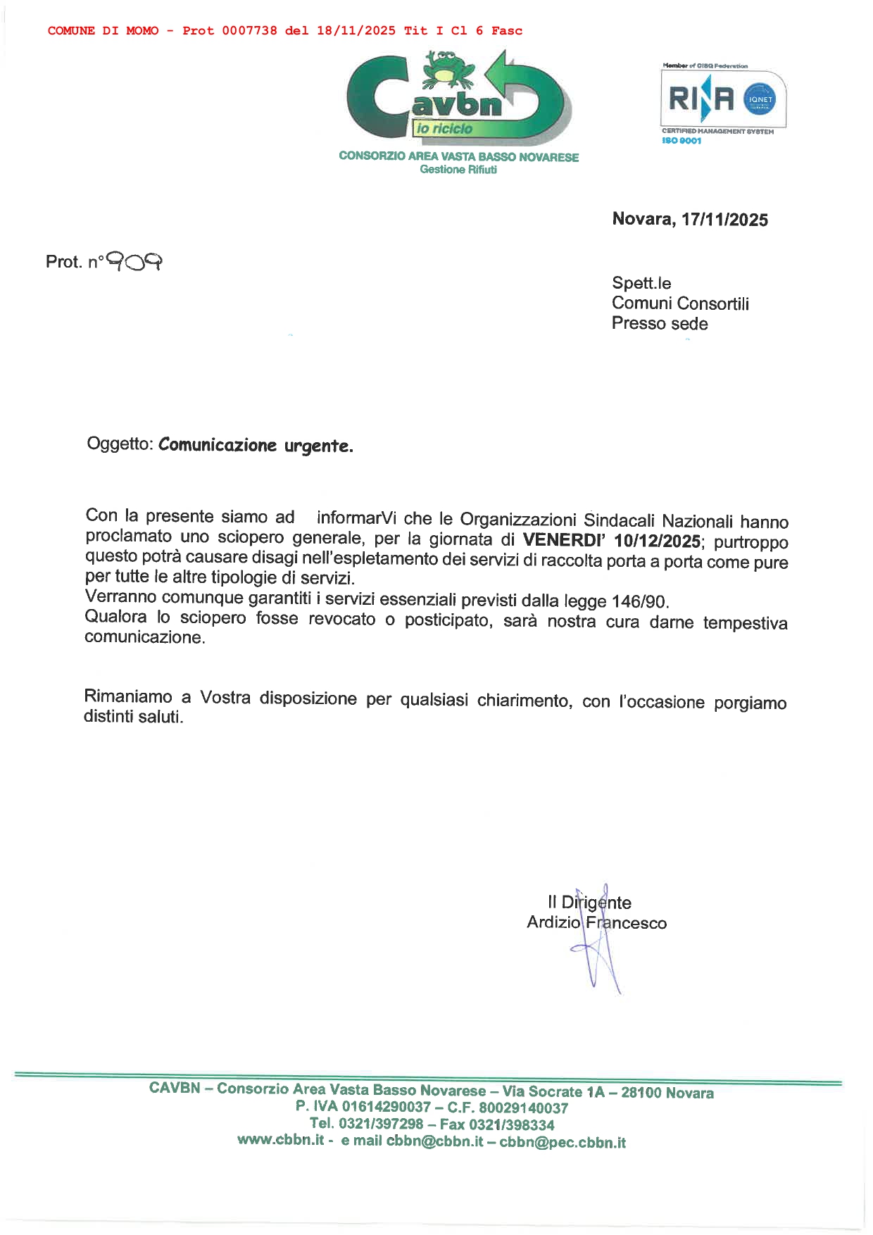Si allega avviso di sciopero per venerdì 30 dicembre 2025 del Consorzio Area Vasta Basso Novarese