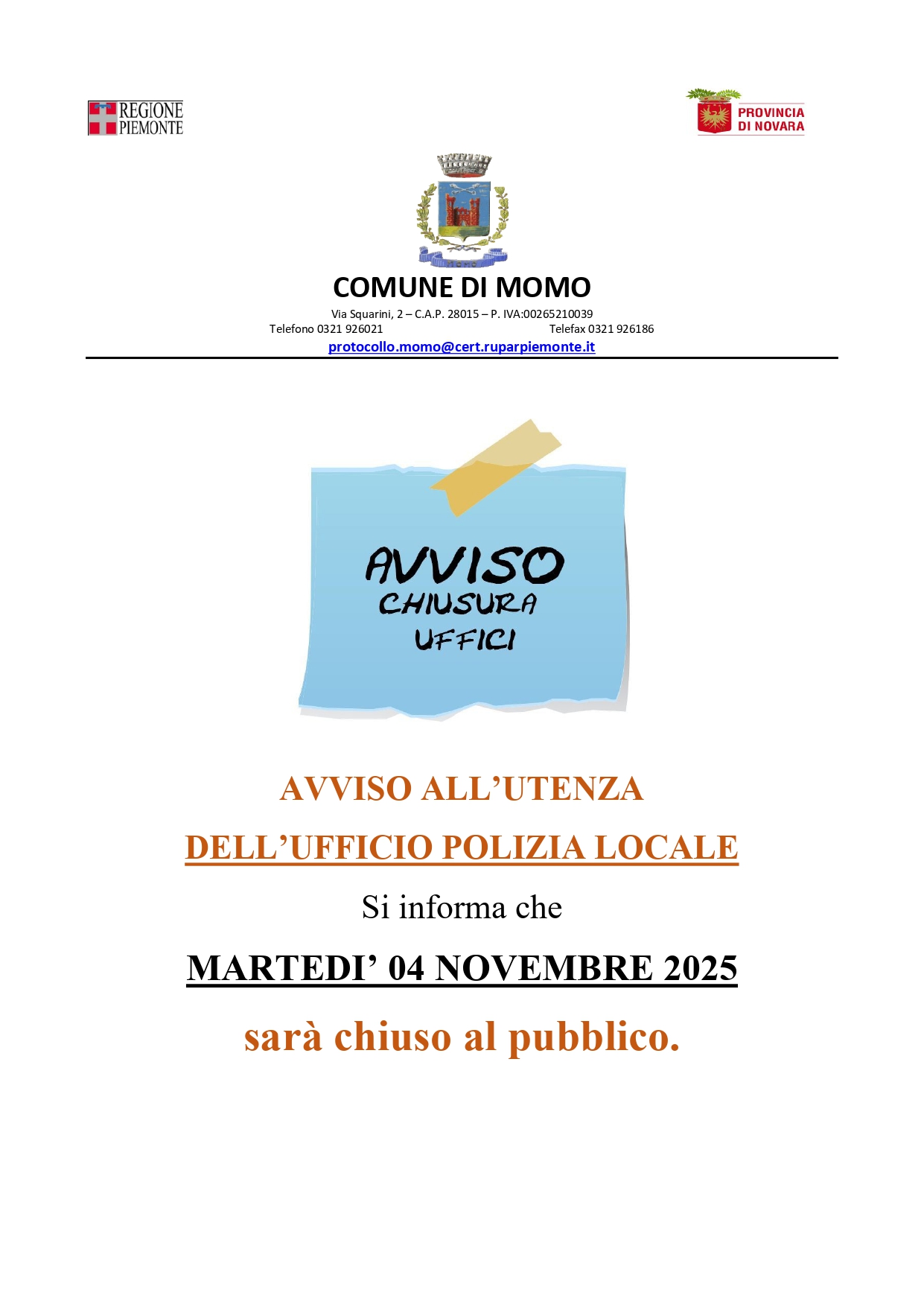 si informa che martedi’ 04 novembre 2025 sarà chiuso al pubblico.