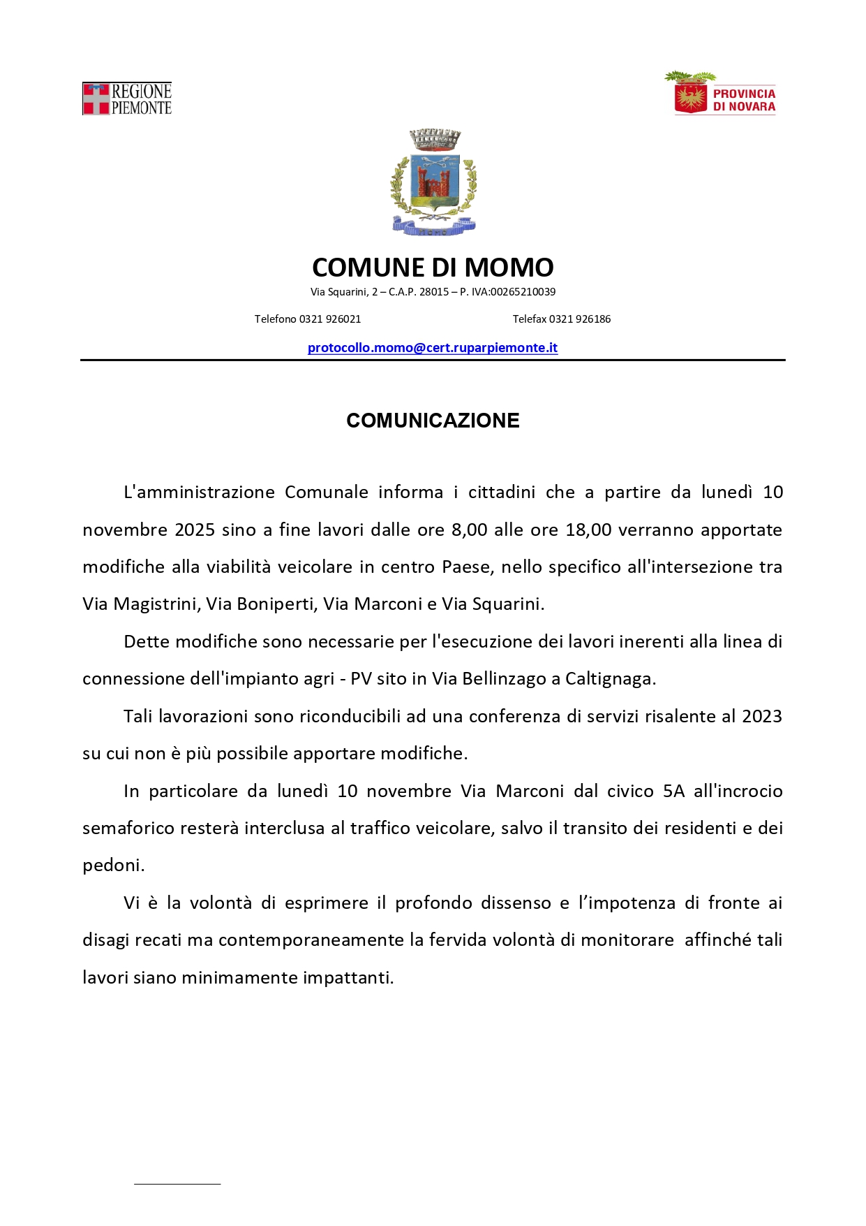 L'amministrazione Comunale informa i cittadini che a partire da lunedì 10 novembre 2025 sino a fine lavori dalle ore 8,00 alle ore 18,00 verranno apportate modifiche alla viabilità veicolare in centro Paese, nello specifico all'intersezione tra Via Magistrini, Via Boniperti, Via Marconi e Via Squarini.