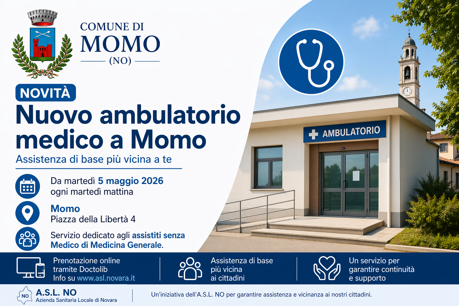A partire dal 5 maggio 2026 sarà attivo a Momo, in Piazza della Libertà 4, l'ambulatorio dedicato ai cittadini rimasti senza Medico di Medicina Generale. L’iniziativa, promossa dall’A.S.L. di Novara e dal Comune di Momo, mira a garantire la continuità dell’assistenza sanitaria di base sul territorio.