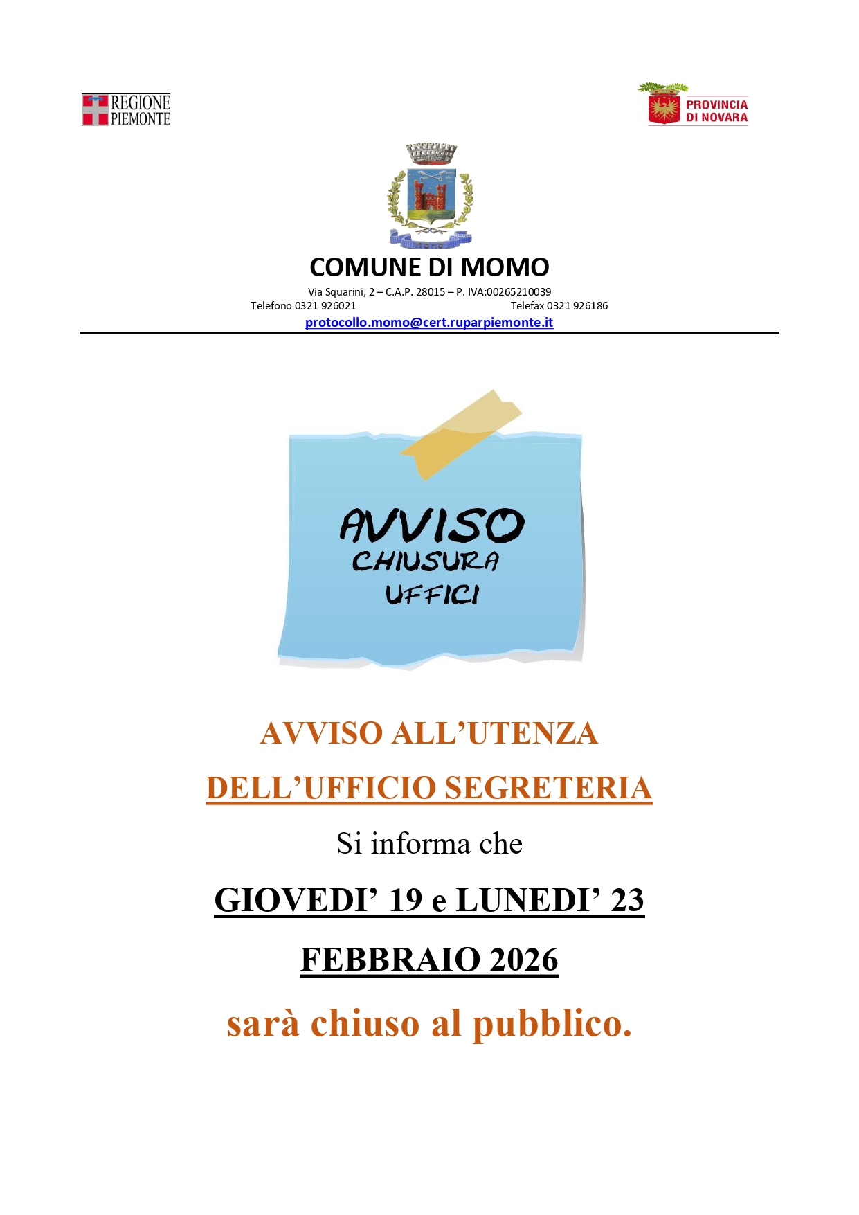 avviso all’utenza dell’ufficio segreteria si informa che giovedi’ 19 e lunedi’ 23 febbraio 2026